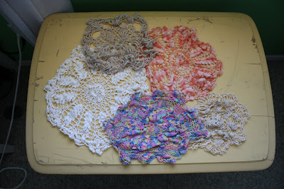 My daughter Carrie and I love going to garage sales - especially estate sales where you can find all kinds of great vintage stuff! About a year ago we found some doilies at a garage sale and they have been in my drawer ever since, crumpled up in the same condition in which we purchased them.